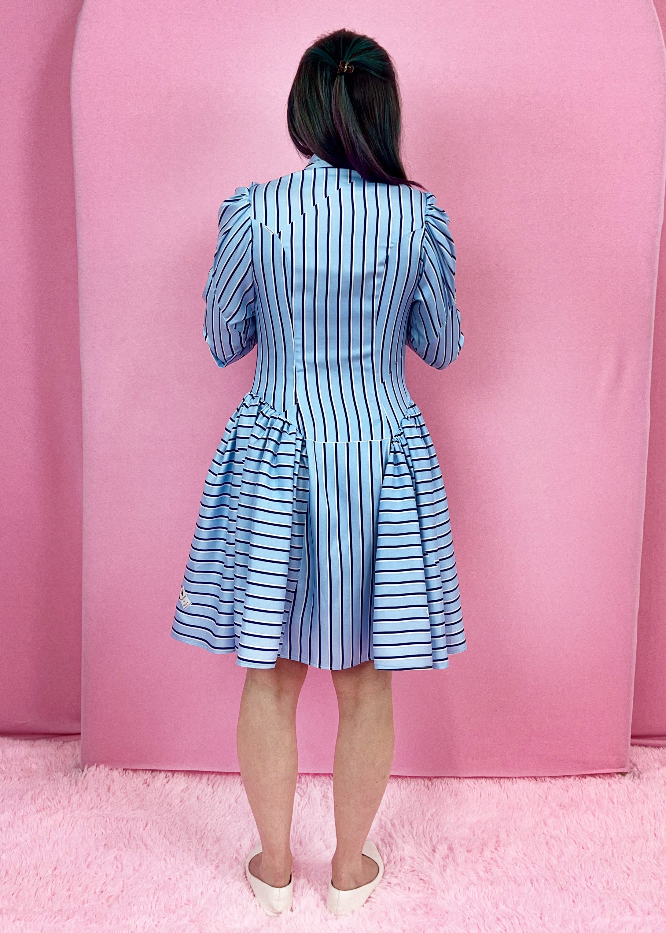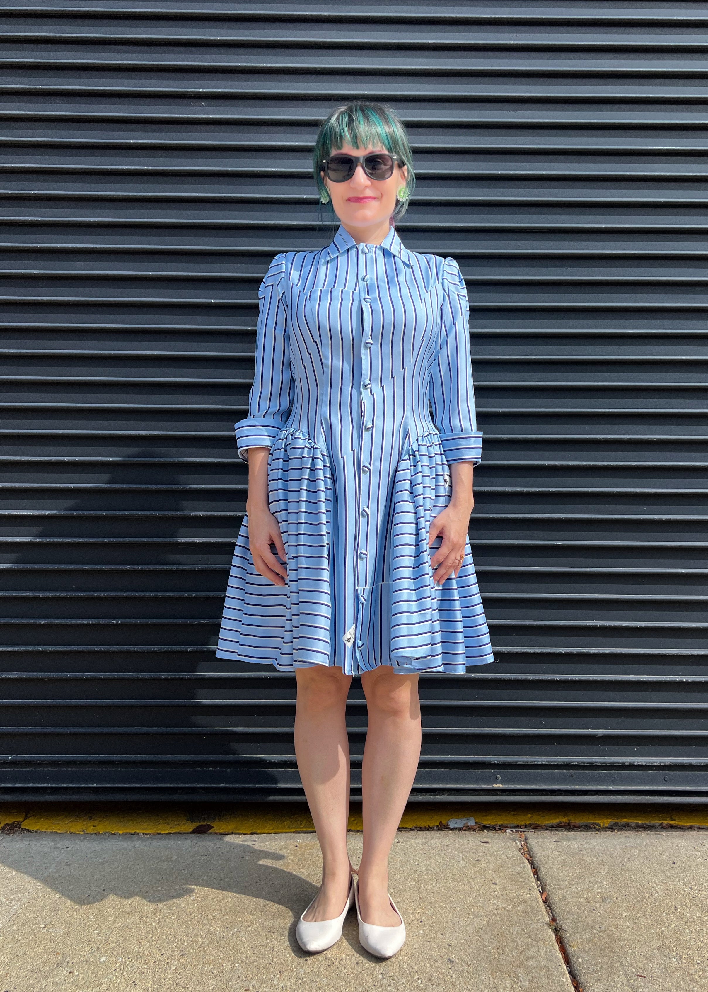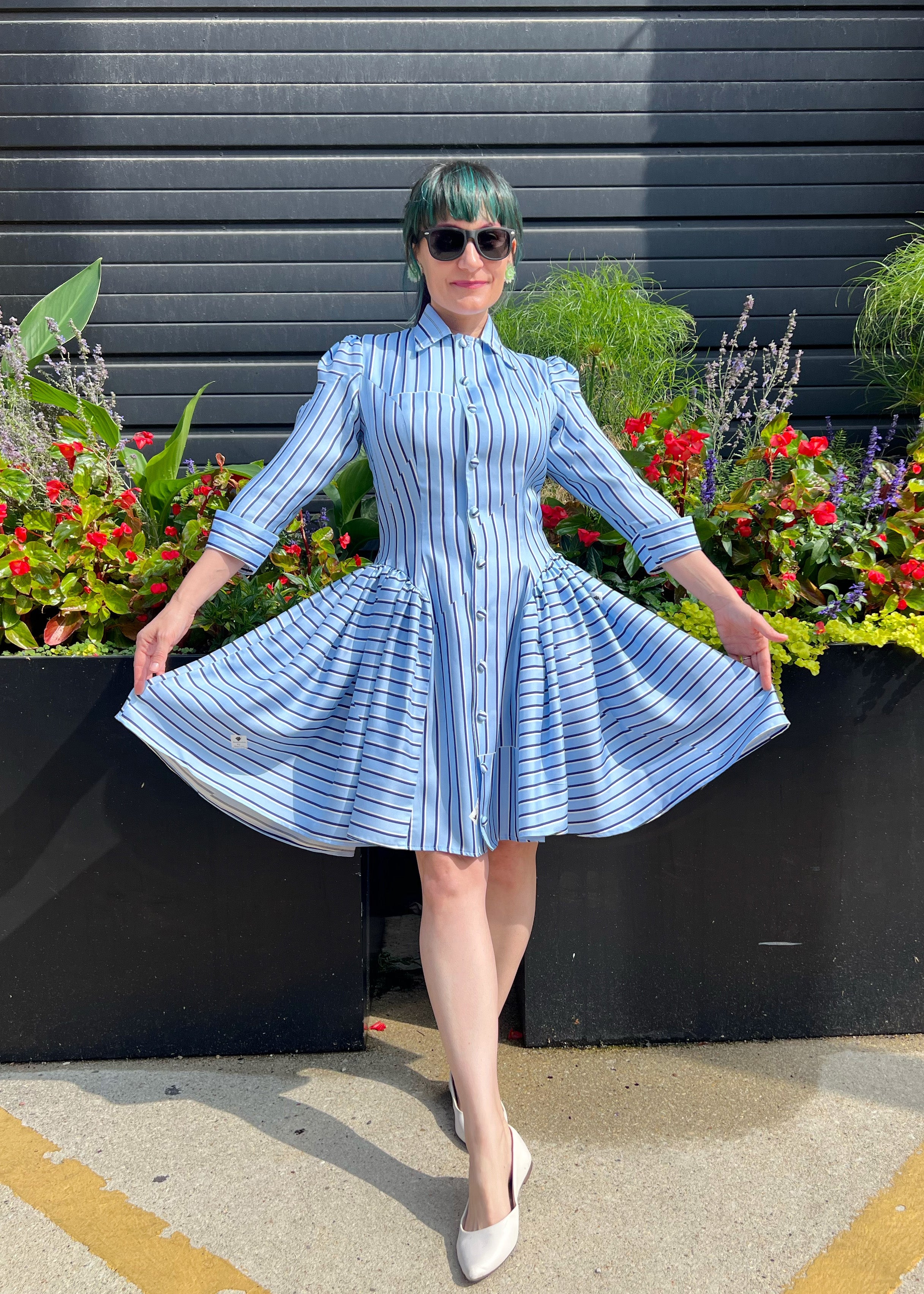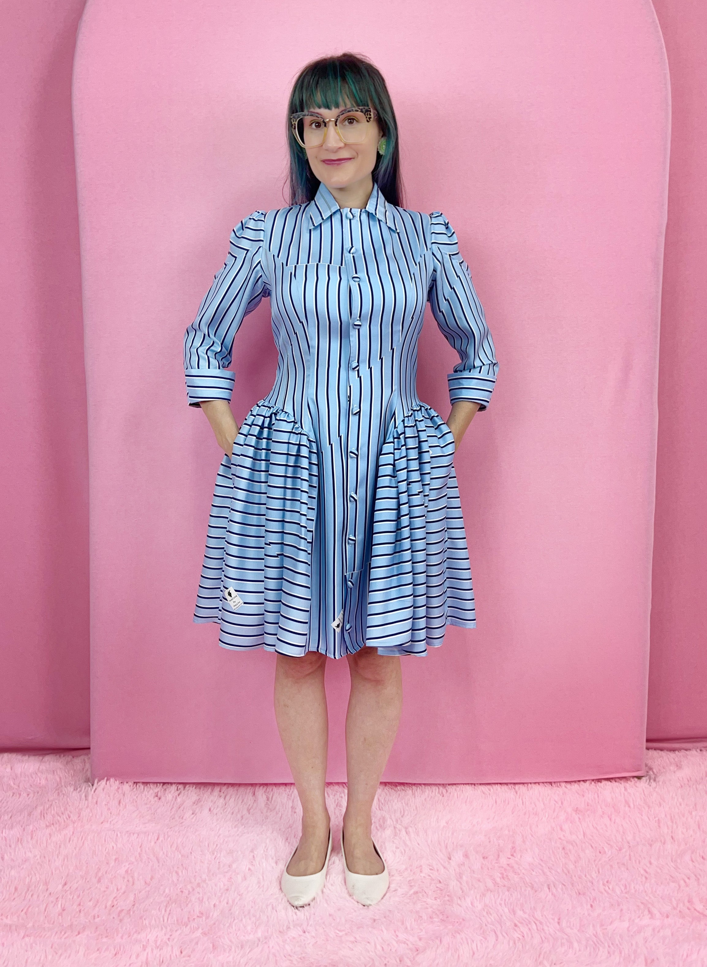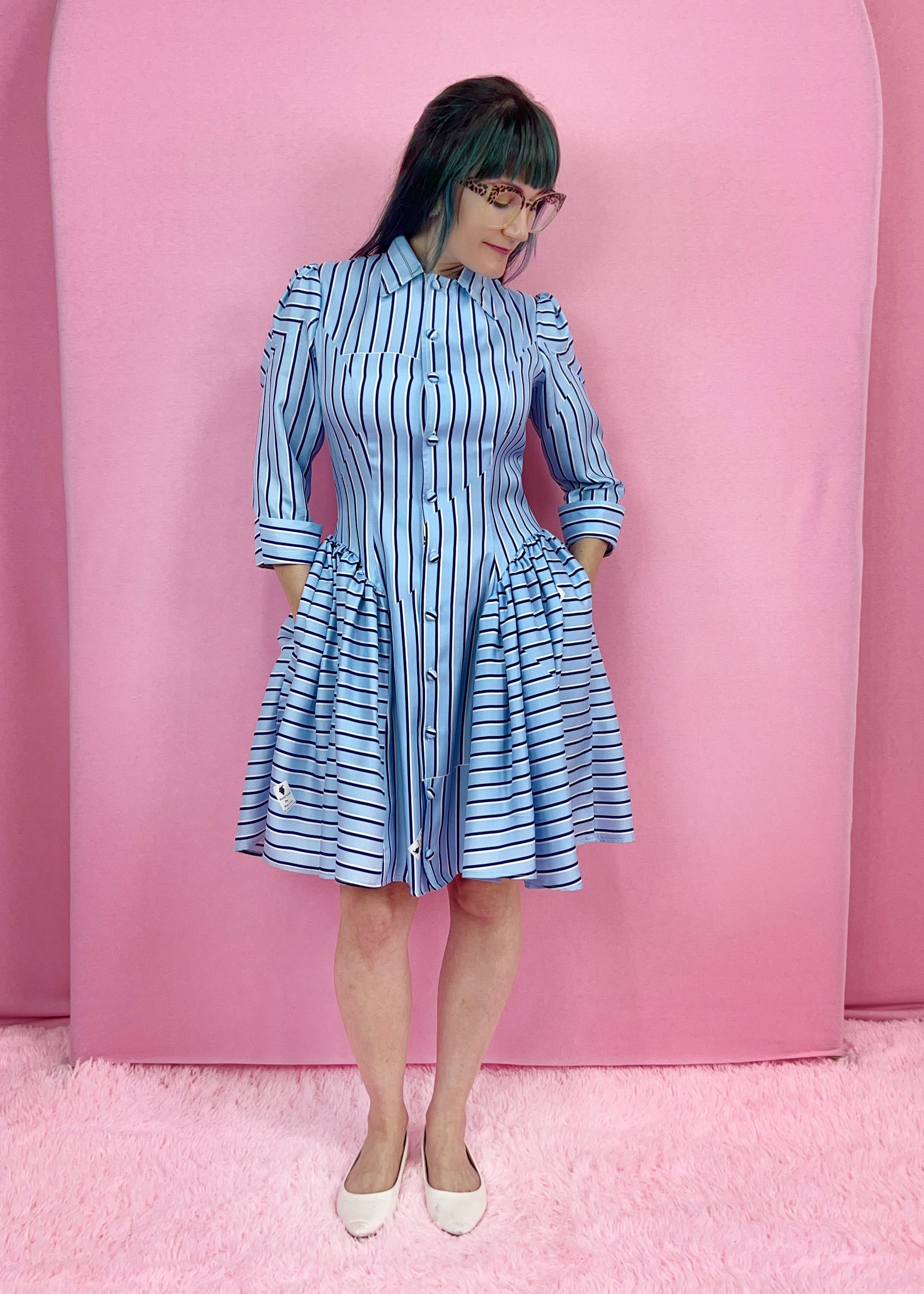 This clean, classically tailored silhouette has gathers at the hips making the dress super fun. I created this dress because I wanted a shirt dress with princess lines that included the new trend I call 'hip puffs.' They're not really new though. They harken back to Victorian times and even to the early 18th century panniers. Fashion keeps coming back to them because they're incredible. This is a more refined, subtle version keeping the puffiness flattering using the other current trend - a drop waist. Plus there are hidden pockets! Similarly, the princess lines are carried out into the arm, adding a beautiful detail and keeping the puff in line. This dress can be made out of anything from silk satin, for an evening out or flannel for a practical, easy to wear fall or winter dress. I especially like it with stripes too.
